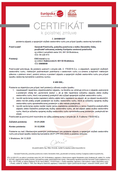 CK uzatvorila zmluvu zabezpečujúcu ochranu pre prípad úpadku s poskytovateľom ochrany pre prípad úpadku Generali Poisťovňa, a.s., odštepný závod Európska cestovná poisťovňa, so sídlom Lamačská cesta 3/A, 841 04 Bratislava, zapísaná v Obchodnom registri Okresného súdu Bratislava I., oddiel Sa, vložka č. 1325/B, IČO: 3570 9332.