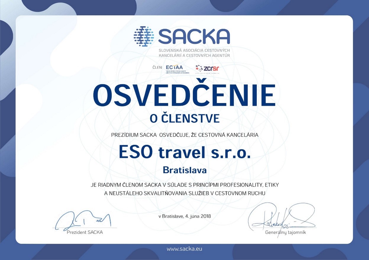 Od roku 2018 sme riadnym členom SACKA (Slovenská Asociácia Cestovných Kancelárii a Cestovných Agentúr). Aktívne sa zapájame do problematiky ktorú táto organizácia zastrešuje a zúčastňujeme sa na školeniach, seminároch, kluboch a valných zhromaždeniach.